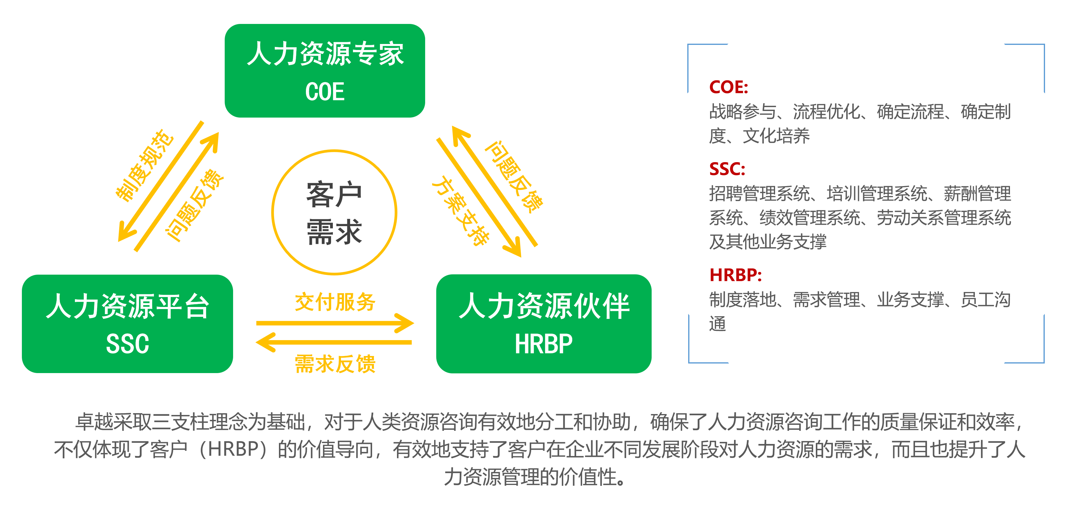 卓越采用国际先进的人力资源三支柱模型,通过客户HRBP反馈的客户需求,卓越SSC整理归集需求后反馈给卓越COE,卓越COE在给出具体支持方案流程等给企业HRBP,其核心思想就是把人当做“资本”而不是“资源”,将“人力资本”当成一项业务来经营,重新定位了客户人力资源管理部门,从职能导向转向业务导向,要求 HR 要像业务单元一样运作,以实现业绩倍增。