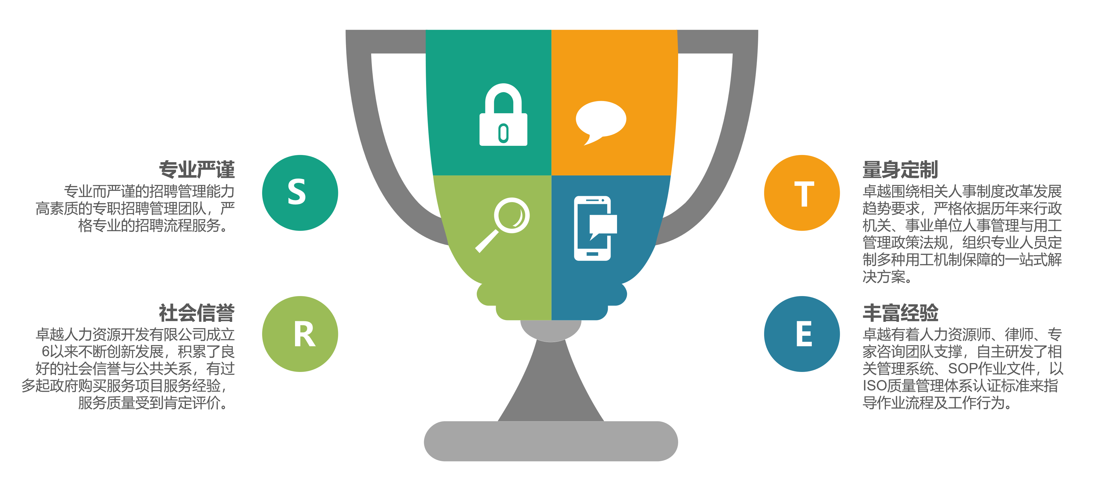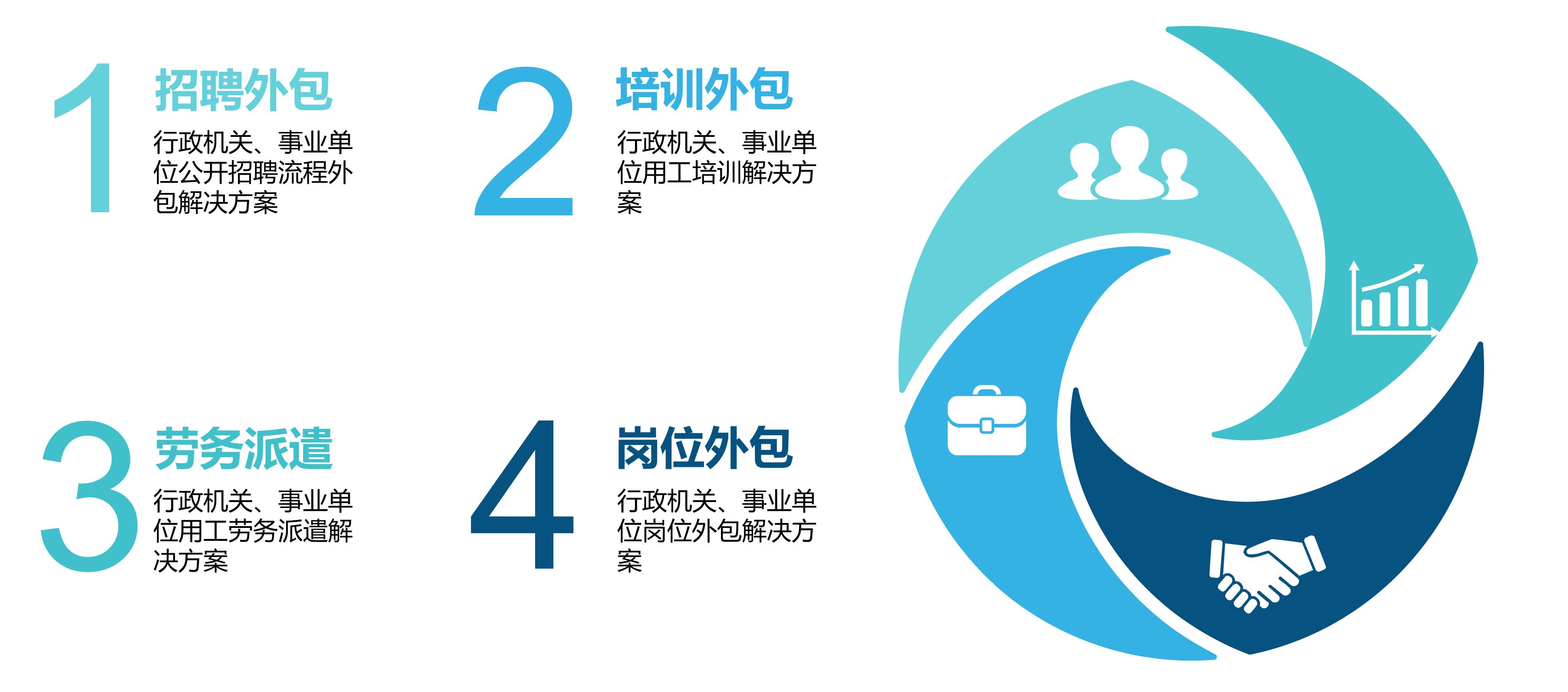卓越行政事业单位用工解决方案是为了满足行政事业单位的机制创新、缓解短期(突发项目或季节性)人员编制与工作量矛盾以及编外人员管理等需求,由卓越公司根据具体要求结合国内外经验案例、政策法规,定制岗位外包、劳务外包、及劳务派遣等购买服务为主要承载模式的用工解决方案。