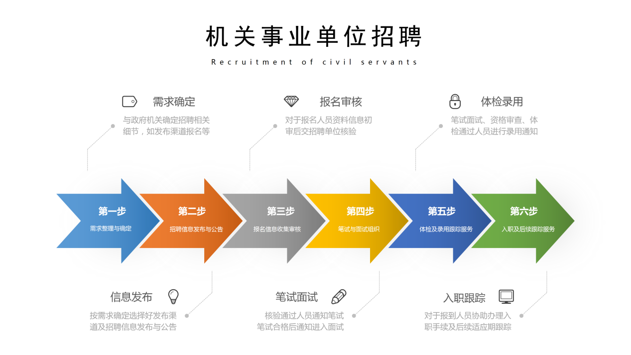 行政机关、事业单位招考招聘整个流程外包:需求整理、招聘/招考信息发布、资料初审、笔试、成绩发布、面试、人才测评、资格审查、体检、入职、后续服务等。
