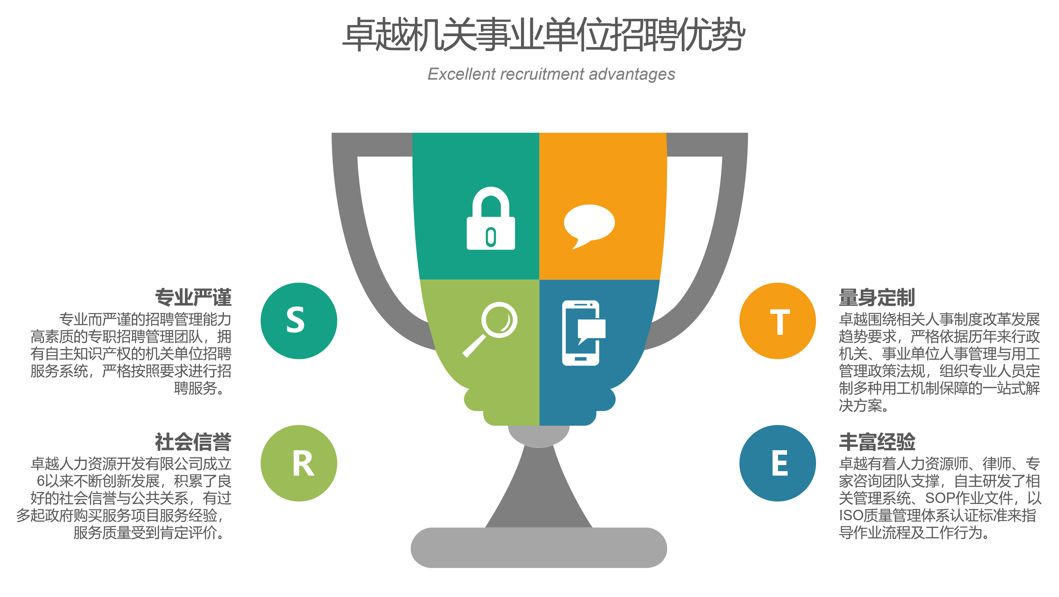 卓越行政机关事业单位招聘服务,是为了满足行政事业单位的机制创新、缓解短期(突发项目或季节性)人员编制与工作量矛盾以及临时聘请编外人员管理等需求,由卓越公司根据具体要求为其提供招聘流程设计、渠道多样化定制与管理,通过自主知识产权的行政机关单位招聘管理系统,为招聘单位与求职者提供实时招聘进度与求职者报考、笔试、面试等一系列管理,提供“一站式综合效能”人员招聘解决方案。
